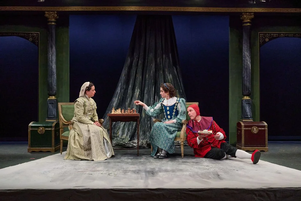 O’Malley Steuerman as Isabel, Amanda Tudor as Sofonisba, and Peter Boyer as the Fool in Washington Stage Guild’s DC Premiere of SOFONISBA. Director: Deidra LaWan Starnes Photographer: DJ Corey